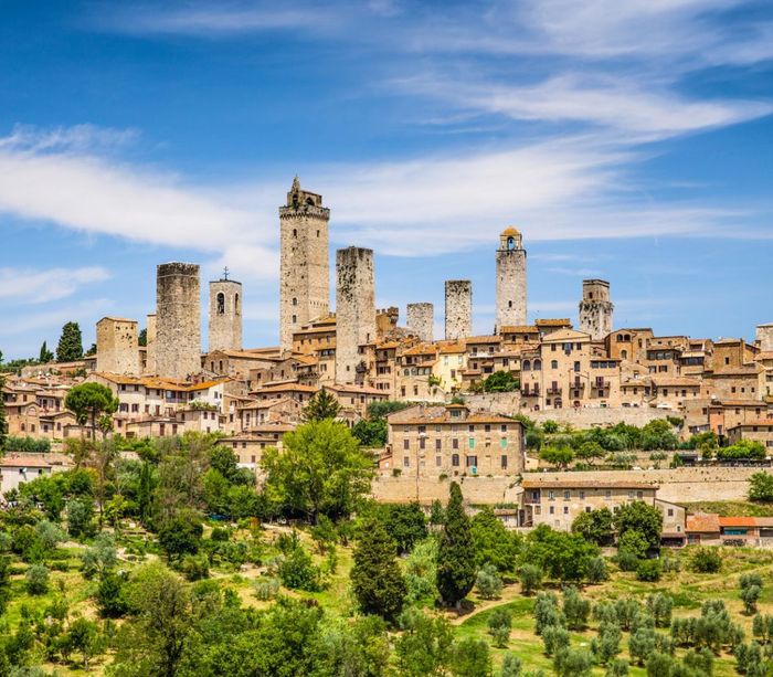 Da qualunque luogo si arrivi, San Gimignano svetta sulla collina, alta 334 metri, con le sue numerose torri. Ancor oggi se ne contano tredici. Dalla costellazione di villaggi rurali di piccole proporzioni del periodo etrusco e poi di quello romano, si passò, verso la fine dell'Alto Medioevo, nel X secolo, alla formazione del nucleo più antico dell'attuale centro storico. Monumenti di particolare interesse sono il Duomo o Chiesa Collegiata, consacrata nel 1148, arricchita da pregevoli affreschi di scuola senese, il Palazzo Comunale e la Chiesa di Sant’Agostino.