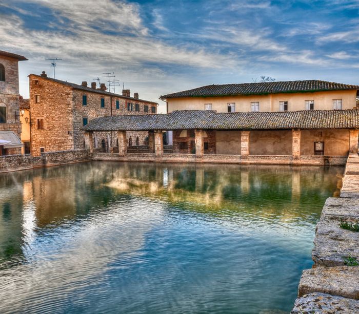 Caratteristica di Bagno Vignoni, che sorge a 5 km da S.Quirico d’Orcia, oltre alle sue acque termali, è la sua struttura, rimasta inalterata nel tempo. La vasca delle acque termali, che sgorgano a 52°, è infatti al centro della piazza, chiusa su tre lati da una cinta di mura alta circa un metro e mezzo. Intorno alcuni edifici, realizzati da Bernardo Rossellino in onore di Pio II, ed il loggiato dove sostò Santa Caterina da Siena.